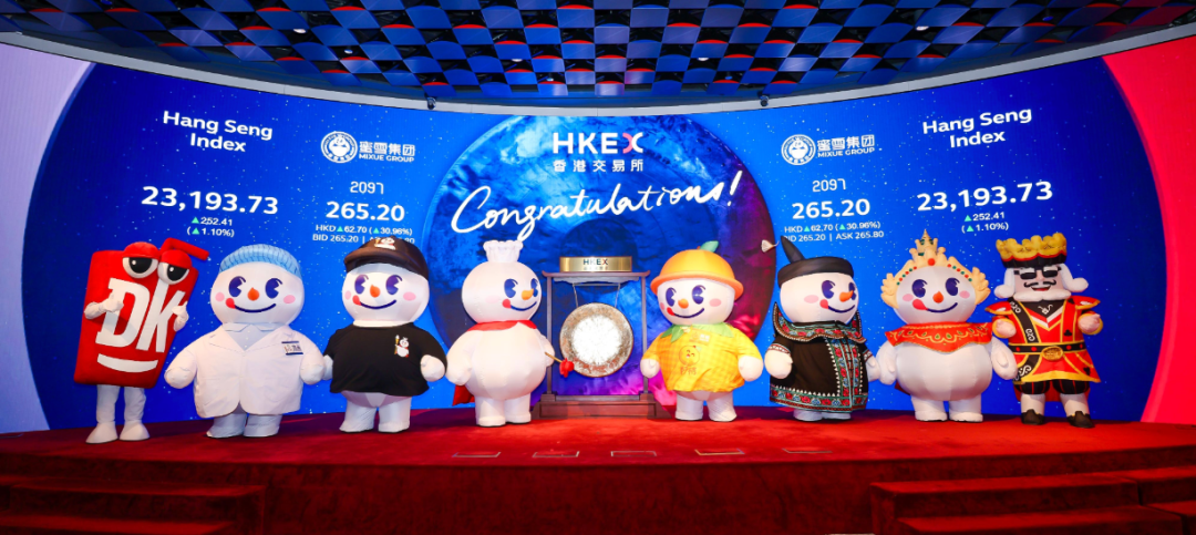 (敲钟现场,站在C位的分别是雪王和其右侧代表消费者的“阿桔”雪王/图源:上海证券报·中国证券网)