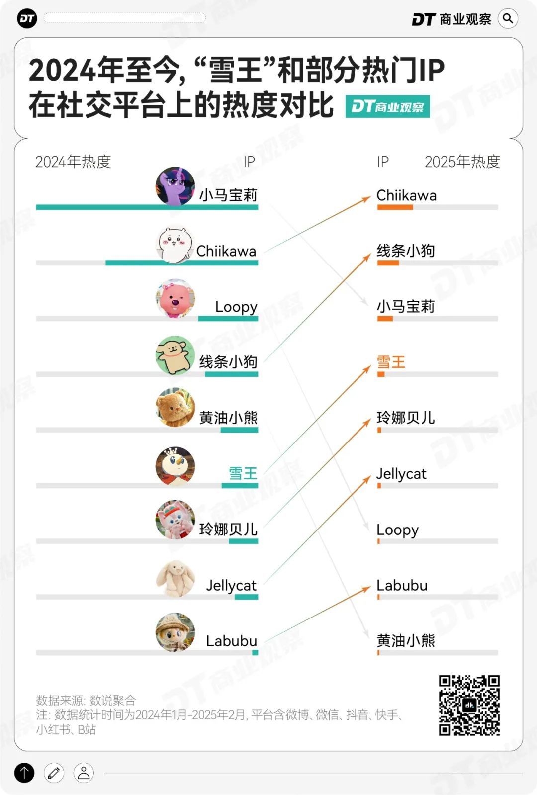 根据数说聚合,2024年声量和互动量较高的IP中,雪王的排名虽然比Chiikawa、Loopy、线条小狗要低,但已经超过了玲娜贝儿和Jellycat。最近更是因为敲钟上市,雪王目前跻身第四名。
