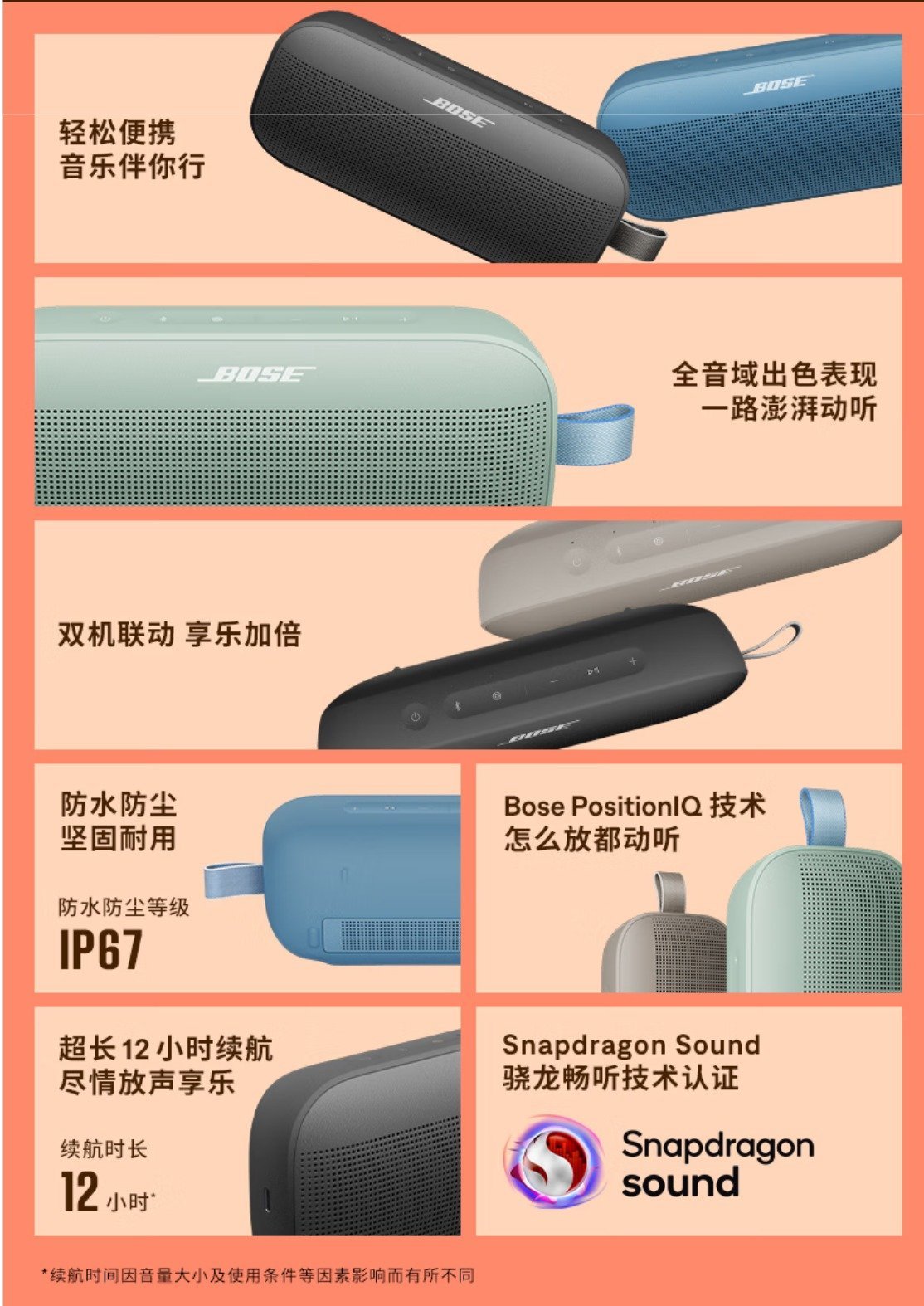 配置方面,Bose SoundLink Flex 第二代搭载了全音域发声单元,有着比较小的体积,方便携带,并且还支持 IP67 级防尘防水。在连接方面,它还支持了骁龙畅听技术,还能支持 12 小时的续航时长。