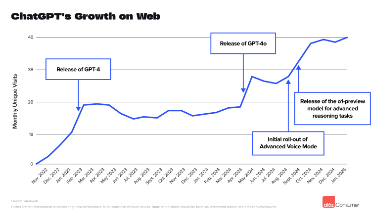 Andreessen Horowitz分析指出,ChatGPT早期增长主要源于用户好奇心驱动,多数用户抱着尝鲜心态使用,尚未形成稳定的使用习惯。因此在初期爆发式增长后,用户量趋于平稳并出现小幅波动,直至GPT-4o发布再次迎来增长,1个月内用户量从2亿攀升至近3亿。随后,高级语音模式和o1预览版的推出推动用户量从约3亿进一步增长至4亿。