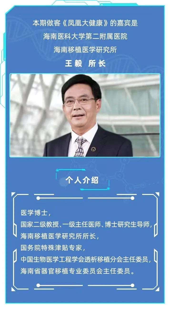 本期做客《凤凰大健康》的嘉宾是海南移植医学研究所所长王毅,海南医科大学第二附属医院神经内科主任游咏