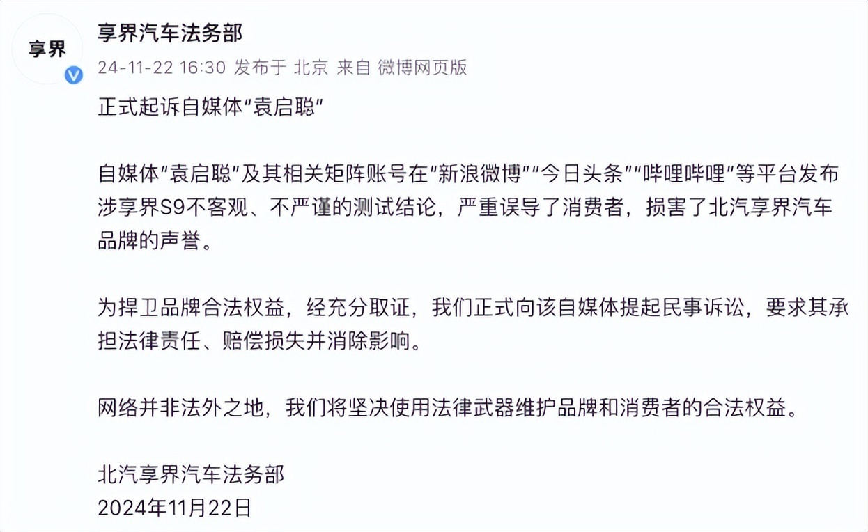 去年11月,华为与北汽合作的享界汽车法务部在社交平台发文宣布,将正式起诉自媒体“袁启聪”。