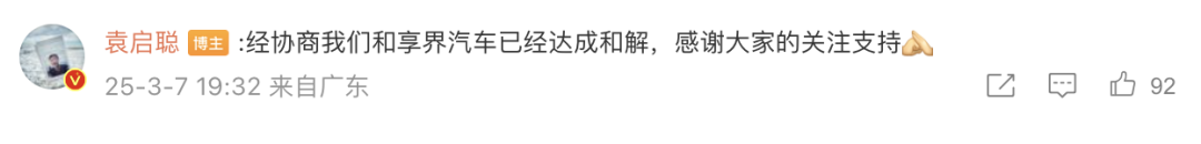 随后,“袁启聪”在评论区表示:“经协商我们和享界汽车已经达成和解,感谢大家的关注支持。”