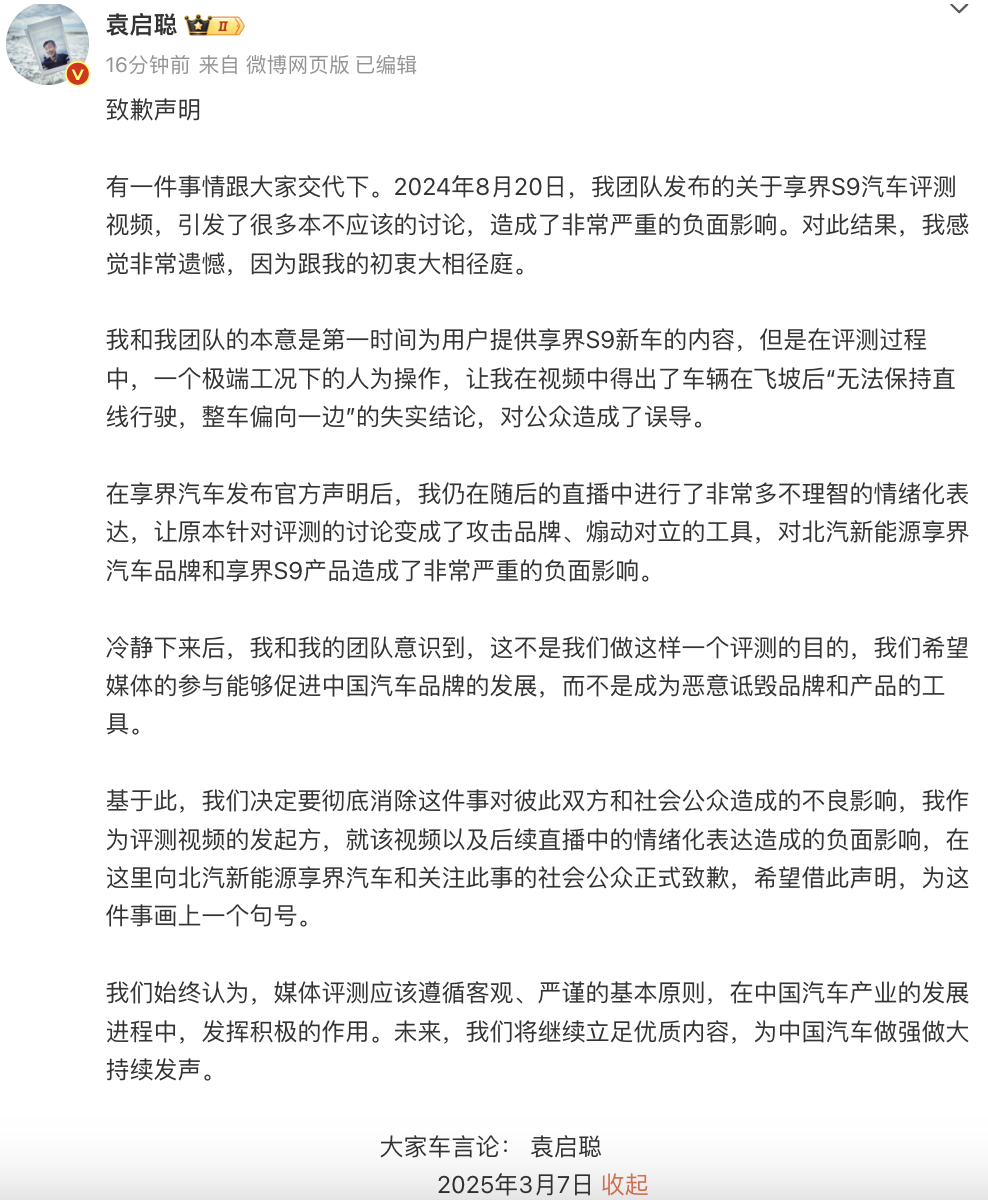 3月7日,“袁启聪”发布“致歉声明”,就去年 8 月发布的享界 S9 汽车评测视频造成的负面影响致歉。