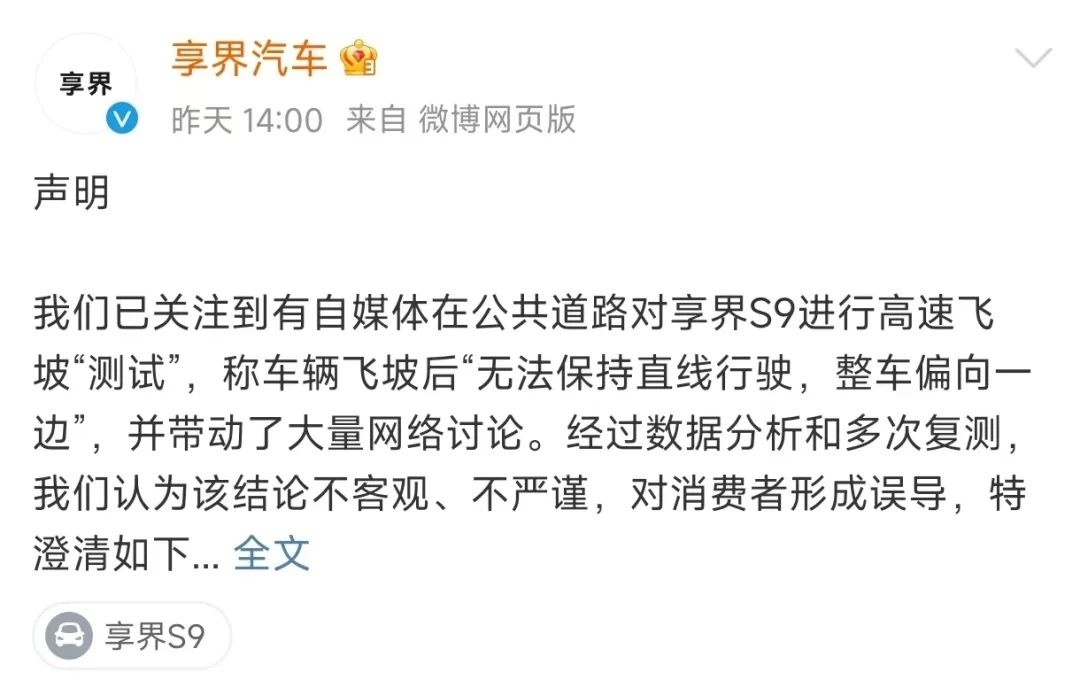 “我和我团队的本意是第一时间为用户提供享界S9新车的内容,但是在评测过程中,一个极端工况下的人为操作,让我在视频中得出了车辆在飞坡后“无法保持直线行驶,整车偏向一边”的失实结论,对公众造成了误导。”