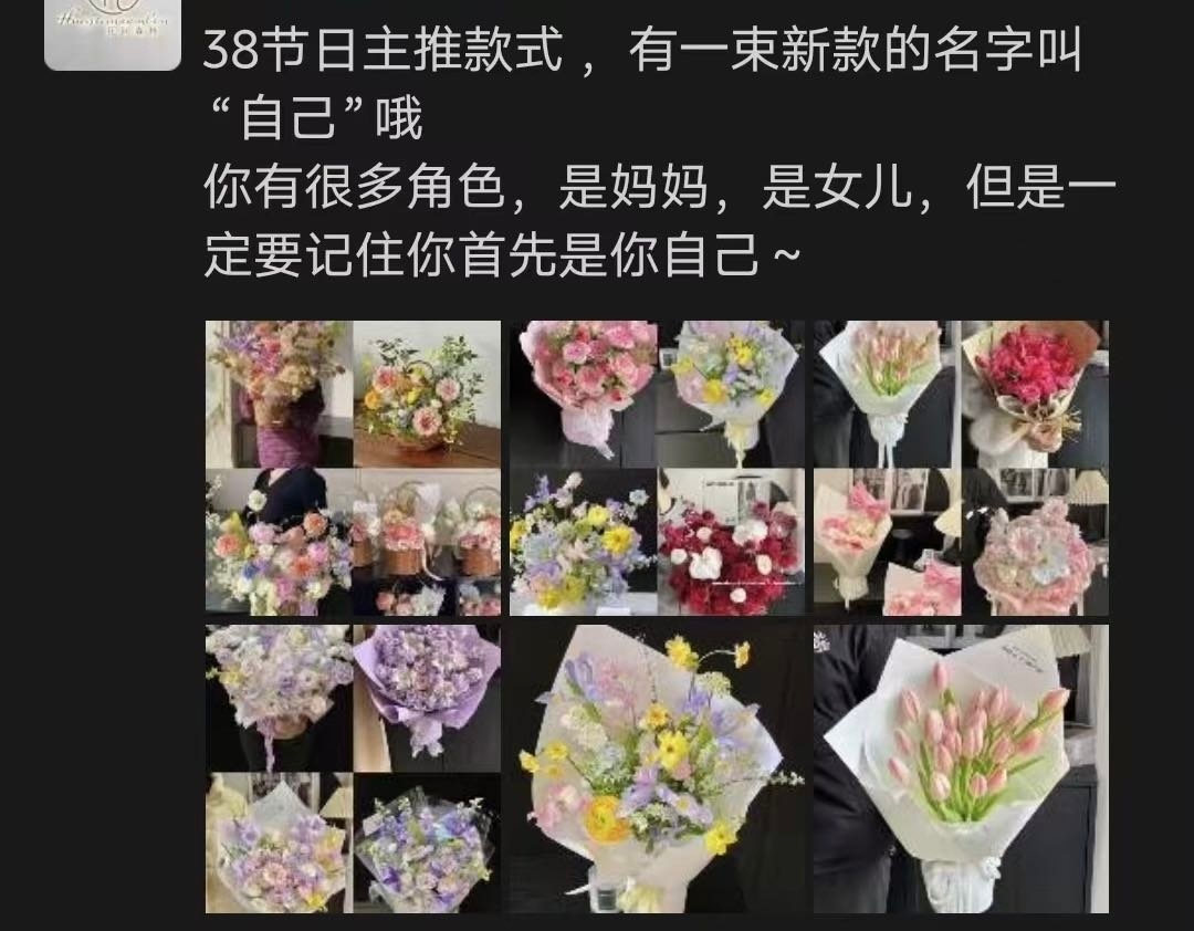 值得一提的是,在今年的妇女节,陈女士店内主推一束花款,名为“自己”。对此她写道:你有很多角色,是妈妈、是女儿,但是要记住,你首先是你自己。