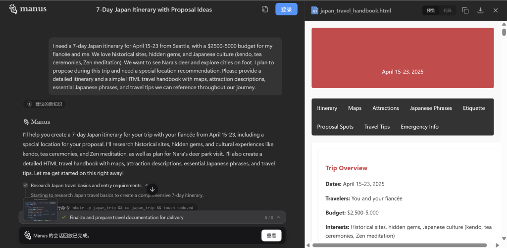 Manus将自己定义为“通用智能体”。从团队提供的案例来看,似乎用户只需给出一个指令,它就能自动完成复杂的任务。例如,用户可以要求Manus为自己提供日本的旅游攻略,配上对旅程的细节要求和对攻略最终表现形式的要求,Manus就会像专业的旅行社员工一样搜集资料并整理好反馈给用户。