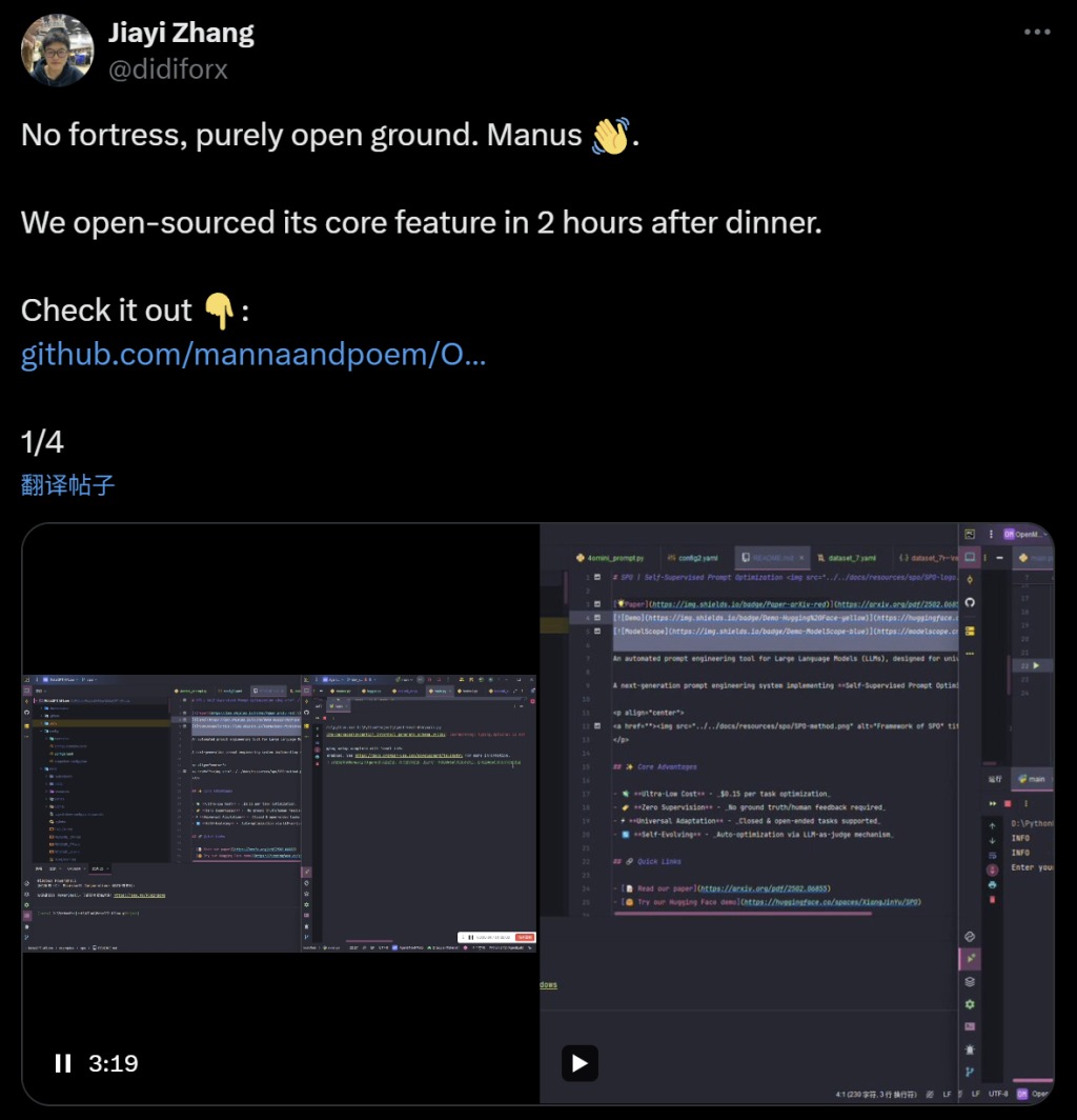 OpenMunus的开发者之一Jiayi Zhang在介绍项目时称“没有壁垒,完全开放”。来源:X平台