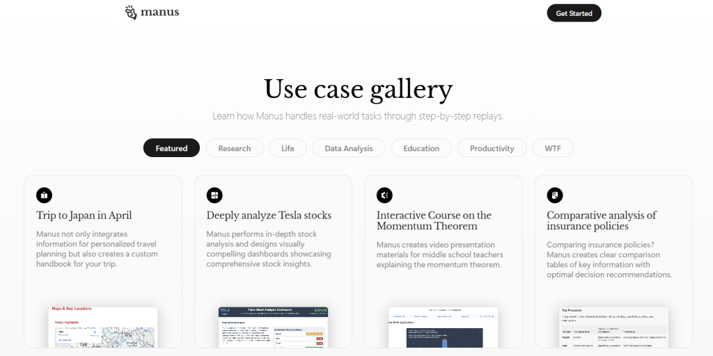 Manus官网上放出了多个准备好的案例用以回放。来源:Manus
