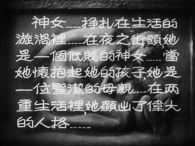 如电影开头的字幕所说——“神女——挣扎在生活的漩涡里,在夜之街头,她是一个低贱的神女,当她怀抱起她的孩子,她是一位圣洁的母亲。在两重生活里,她显出了伟大的人格。”
