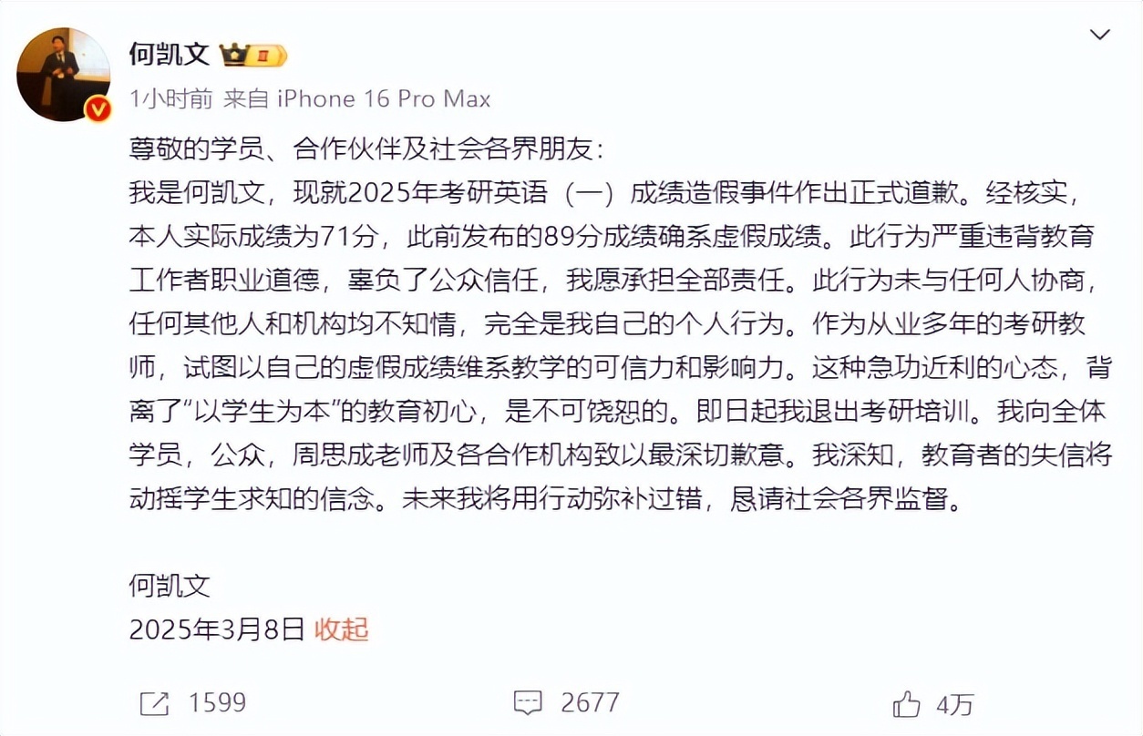 何凯文写道:“我是何凯文,现就2025年考研英语(一)成绩造假事件作出正式道歉。经核实,本人实际成绩为71分,此前发布的89分成绩确系虚假成绩。此行为严重违背教育工作者职业道德,辜负了公众信任,我愿承担全部责任。此行为未与任何人协商,任何其他人和机构均不知情,完全是我自己的个人行为。作为从业多年的考研教师,试图以自己的虚假成绩维系教学的可信力和影响力。这种急功近利的心态,背离了‘以学生为本’的教育初心,是不可饶恕的。”