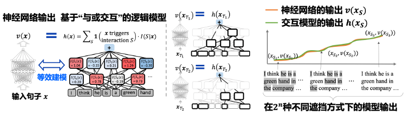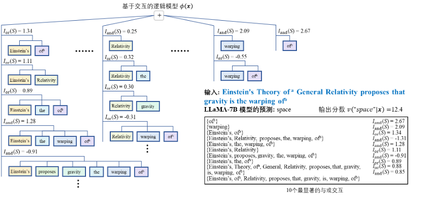 我们可以从给定的大模型与给定的数据中,提取出 100 多个这样的「与或交互」,加合起来在数值上正好等于这个大模型在这个句子上的输出。