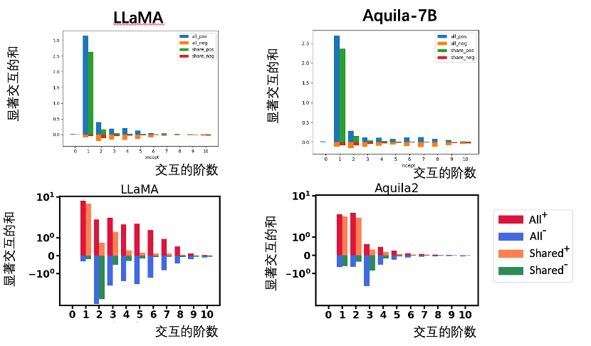 [上图] 相比于 LLaMA-7B,原始的 Aquila-7B 建模更多高阶交互,表征质量更差:两模型建模了相似的低阶交互,Aquila-7B 建模了大量高阶交互,LLaMA-7B 没有建模相似的高阶交互。[下图] 新训练的 Aquila2-34B 建模了更多的低阶交互,表征质量更好:两模型建模了相似的低阶交互,LLaMA-7B 建模的大量高阶交互没有被 Aquila2-34B 建模。