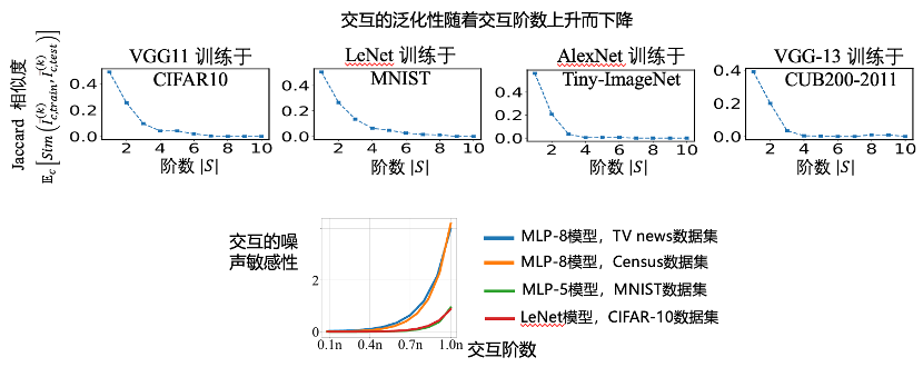 关于泛化性,我们发现交互的阶数越高,泛化性越差。二阶交互指两个单词之间的关系,五阶则指 5 个单词的关系。比如像「白日依山尽,黄河入海流」这样需要多个字词精确匹配的高阶交互,其泛化性就很差。当我们将表征映射到 100-150 个交互时,这个问题就变成可计数的。例如,当某个交互(如人脸识别中眼睛和鼻子的关系)在训练样本中出现频率为 50%,在测试样本中也有接近的出现频率(如 49%),那么这个交互的泛化性就很高。