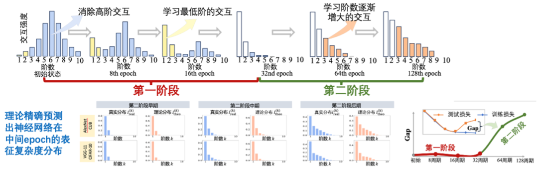 证明并成功预测了神经网络(拟合阶段与过拟合阶段)两阶段现象:神经网络在第一阶段消除高阶交互,最终只学习最低阶的交互;第二阶段学习阶数逐渐增大的交互。