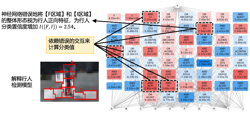 基于等效交互概念解释,评测行人检测的可靠性:分类结果的极高正确率不代表神经网络决策逻辑完全正确。从上图可见,神经网络推理依赖的是鲁棒性低的高阶交互,而且交互中有很多正负抵消,体现了过拟合,并且建模的交互还覆盖了错误的图像区域。