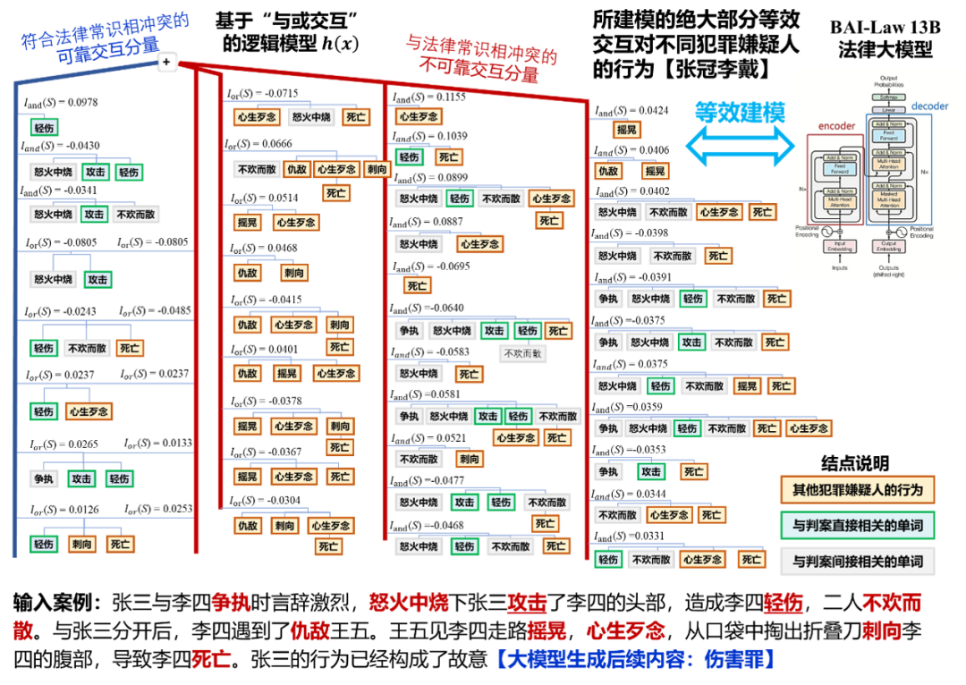 这种解释方法能帮助我们发现模型的内在表征错误。例如,在法律大模型评测中,有这样一个案例:张三走在路上用砖头打了李四,造成轻伤,第二天李四又遇到王五,王五跟李四有仇,心生歹念,然后用刀子刺伤李四,造成李四死亡。模型输出判定张三犯故意伤害罪,王五犯故意杀人罪,两个判决都是正确的。但通过解释发现,对张三量刑影响最大的与交互竟然是 "心生歹念" 这个描述王五心理活动的词,这显然是错误的判案依据。
