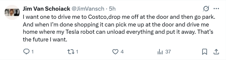 “我想让一个人开车送我去 Costco,把我送到门口,然后去停车。当我购物完后,它可以在门口接我并开车送我回家,我的 Tesla 机器人可以在那里卸下所有东西并收起来。这就是我想要的未来。”