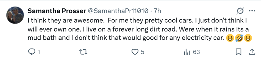 “我认为他们很棒。对我来说,他们是非常酷的汽车。我只是觉得我永远不会拥有它。我住在一条永远漫长的土路上。如果下雨时,它会变成泥浴,我认为这对任何电动汽车都没有好处。”