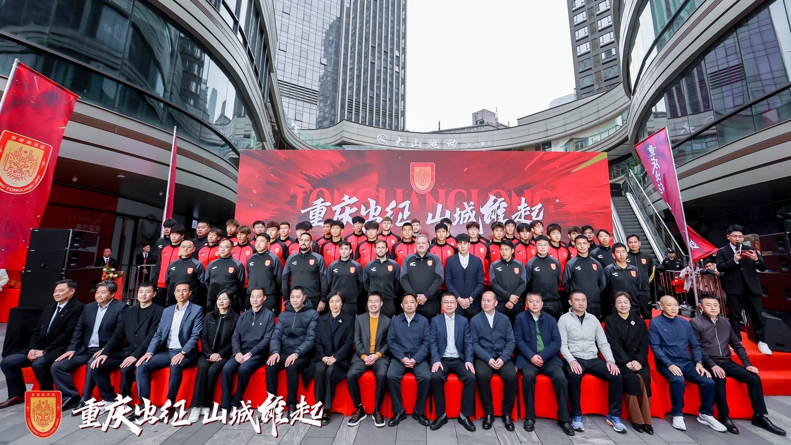 向余望、李镇全、宋攀、刘明仕从李平总经理手中接过全新比赛服,重庆市体育局党组书记、局长袁光灿将队旗授予队长向余望,完成使命交接。全场在主持人带领下齐声喊出了“重庆雄起”的口号。