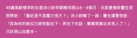 不过,她也告诫其他孕妈,千万注意过度运动,因为她因为孕期依旧维持爬山五六个月,导致胎位下移,被医生建议暂时停止爬山,改为散步。