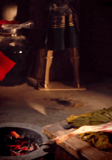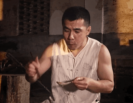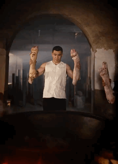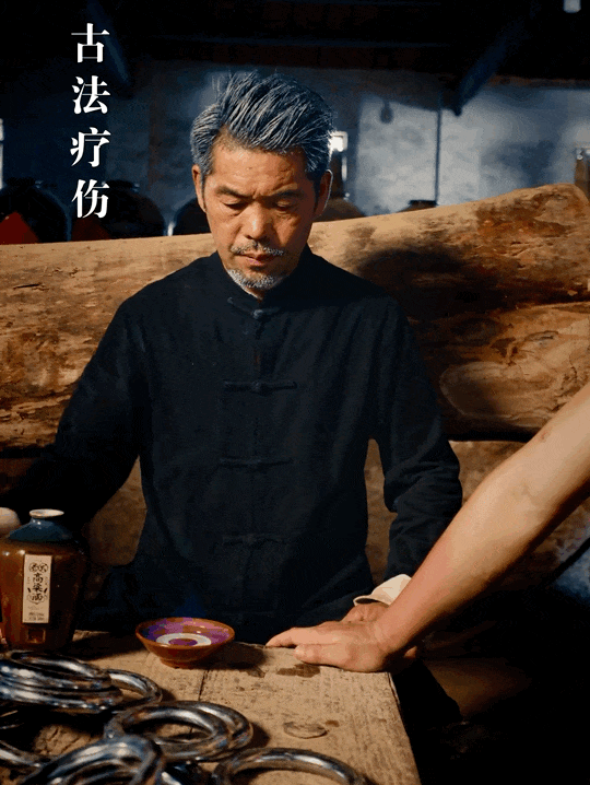 二叔拿火点燃一碗酒,用手快速蘸一下,涂抹在手臂上来回揉搓。