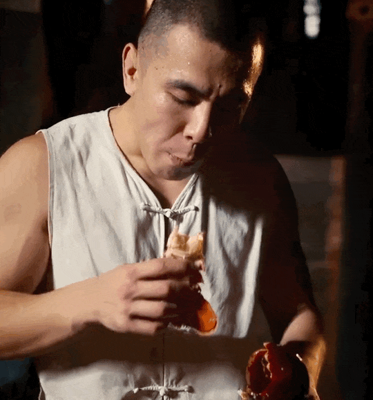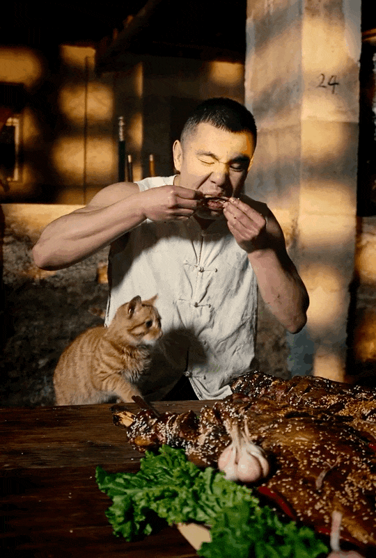 吃完羊排上的肉,他又意犹未尽的啃咬骨头。