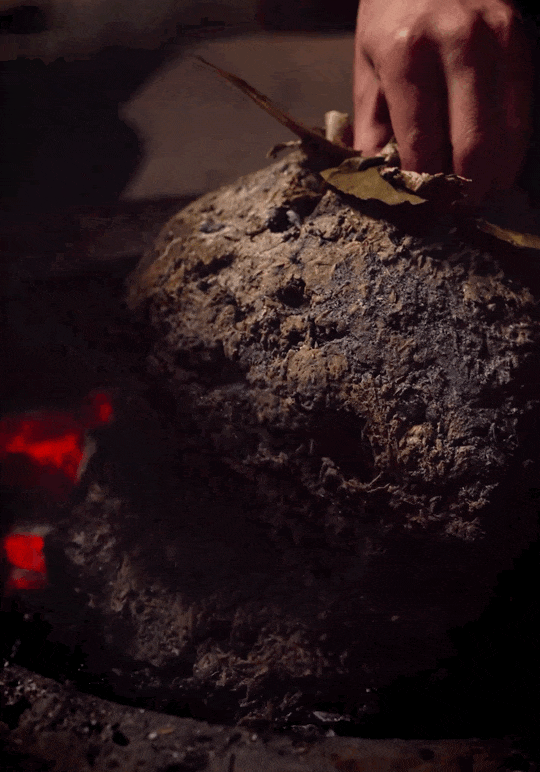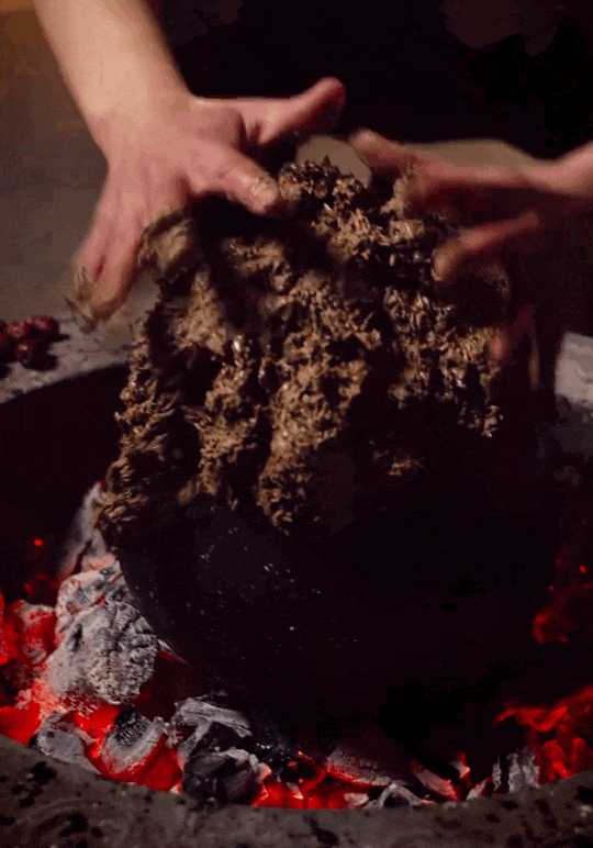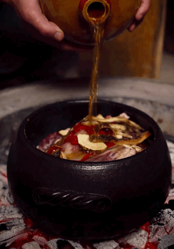 煮好后,用力敲开外面的瓦罐外层的泥土。