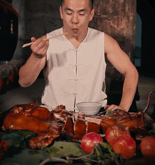 他夹了一块桌上的烤乳猪之后,又连续夹了好几块到碗里。
