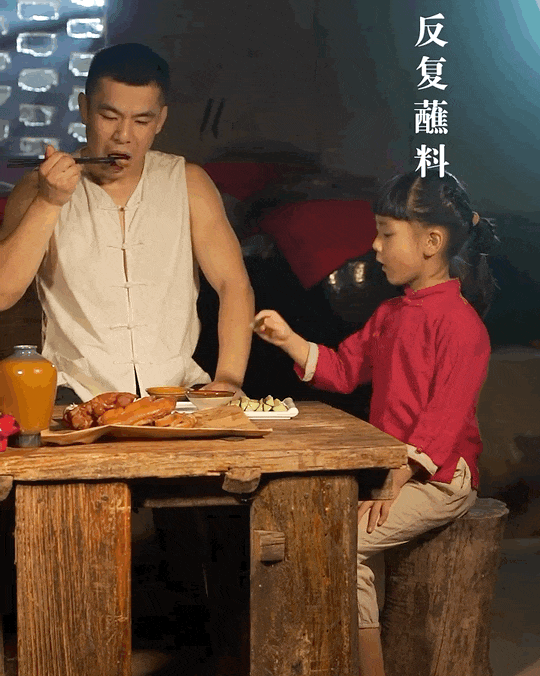 旁边坐着女儿,拿着黄瓜不停地蘸料。