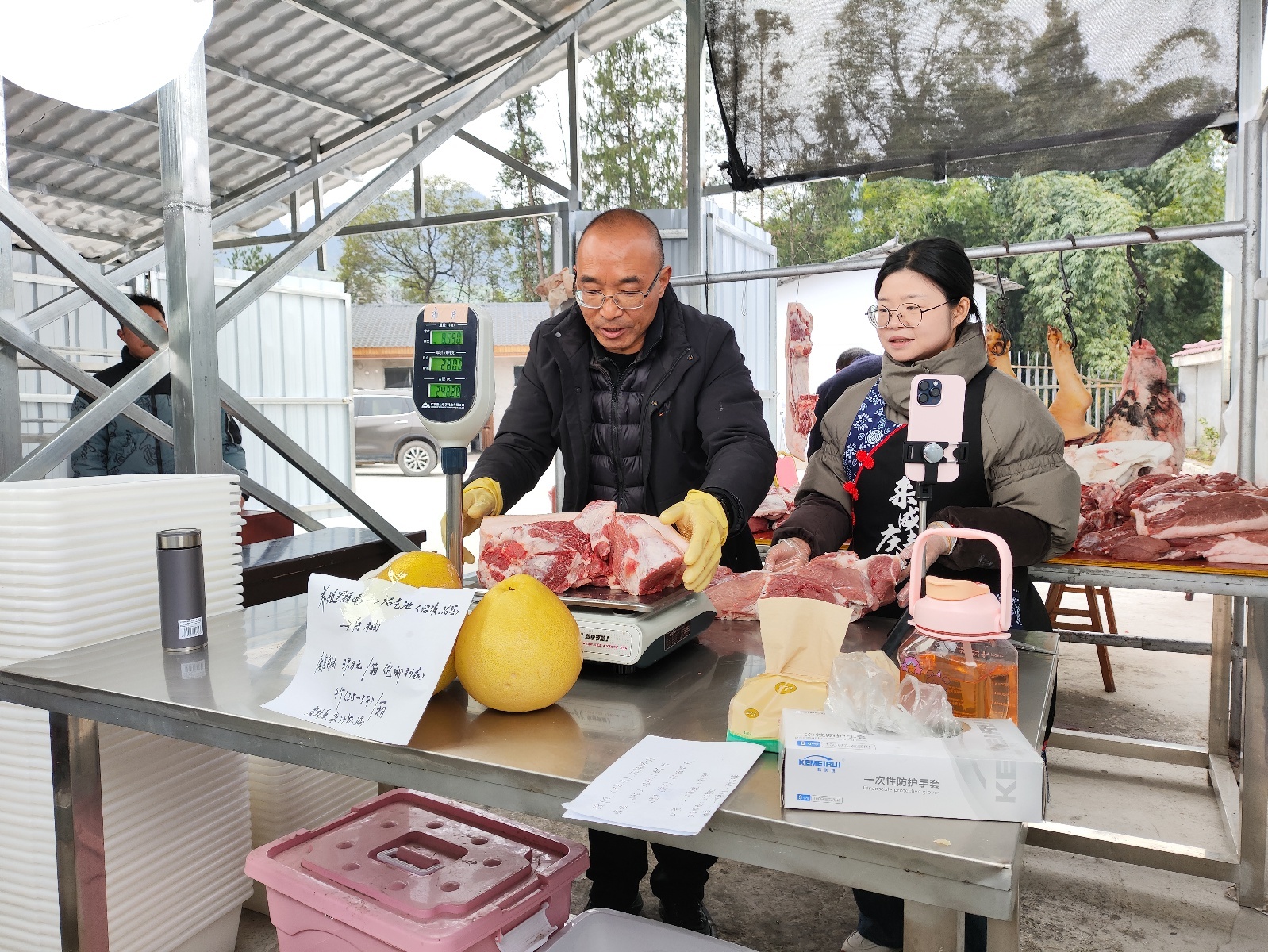 焦宪(左一)在直播卖黑猪肉。图/受访者供图