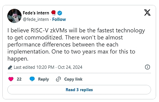 其次,由于市场竞争,生成证明的成本正在下降。如今,Risc Zero、Cysic、Lagrange 和 Succinct 运营着许多竞争性市场。有些仍在测试网中,有些已投入运营。