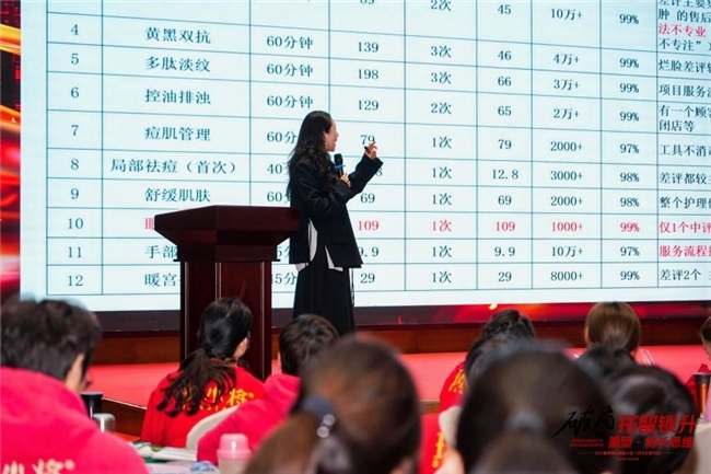 但此次斑小将总部带来的绝非仅仅是落地的课程内容,会议上,品牌创始人亲临现场与现场斑小将体验店主进行深度对话:她直言:“斑小将的优势不是产品数量,而是7年沉淀的真诚与专业。”PPT中列出的数据印证了这一观点——高复购率、2000余家实体店的黏性客户、抖音护肤品项97%~99%的好评率,核心源于“产品+服务”的双重承诺。为了把这些优势能更好地转化为门店竞争力,品牌提出“以培代招”策略:通过专业培训替代传统招商,用服务能力征服客户;通过标准化的面诊流程和卡项设计,将产品效果与客户信任深度绑定。
