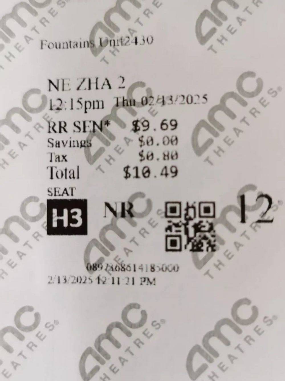 作者2月13日在美国AMC影院看《哪吒2》的电影票。