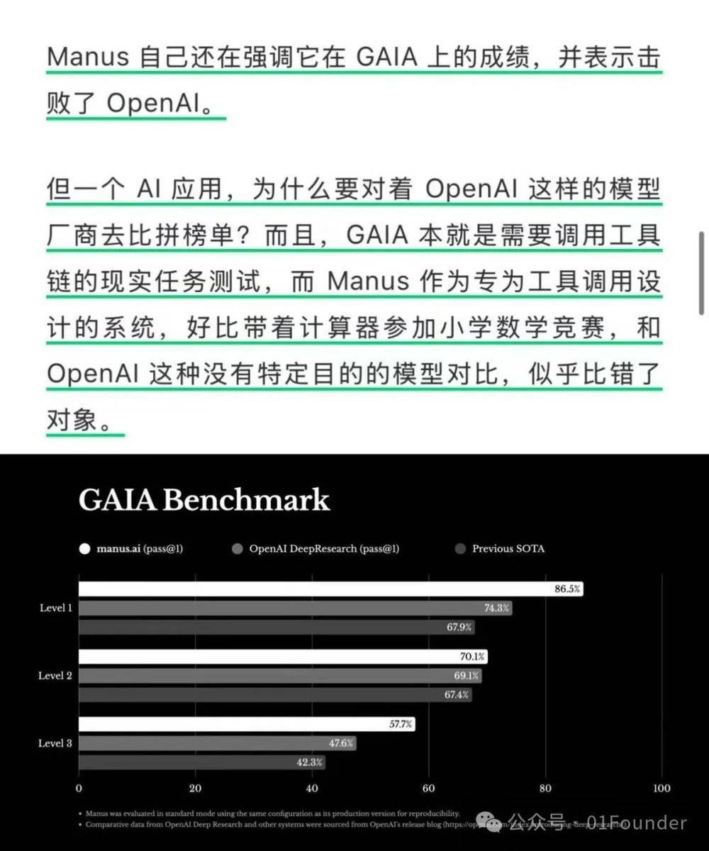 我仔细阅读后发现,该文最大的失实之处在于文章内声称Manus团队故意与OpenAI的基础模型进行对比,但实际上Manus对比恰恰正是OpenAI的而智能体产品Deep Research。