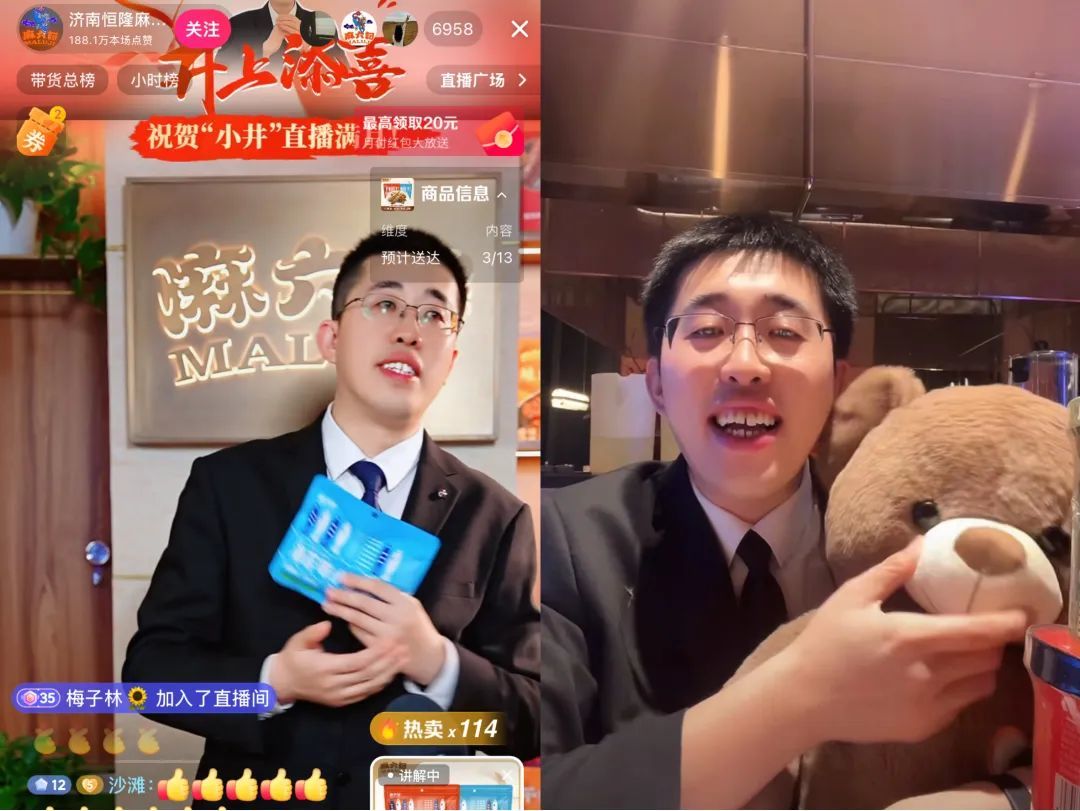 在此之中,济南恒隆门店的餐厅经理“小井”意外走红——在一场直播中,临时被拉上主播位的小井结结巴巴口播“王主公子请下单”,配合他颇具喜感的倒八字眉,立刻收获了观众“怜爱”。