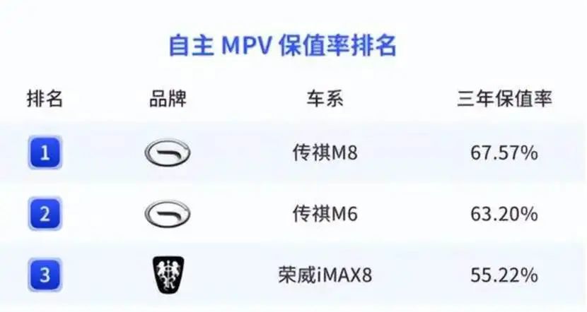 保值率方面,根据2024年度中国汽车流通协会发布的数据,传祺M8和M6的三年保值率分别高达67.57%、63.20%,稳居中国品牌MPV保值率第一和第二。新能源车方面,传祺E8和E9分别以73.68%、73.27%的一年保值率包揽插混MPV保值率榜单的冠亚军。