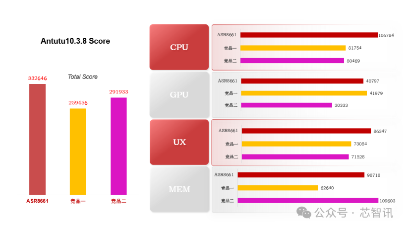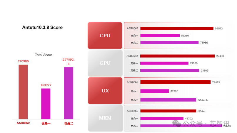 根据Antutu测试数据来看,ASR866X系列的总体性能领先竞品,且兼具性价比的优势。