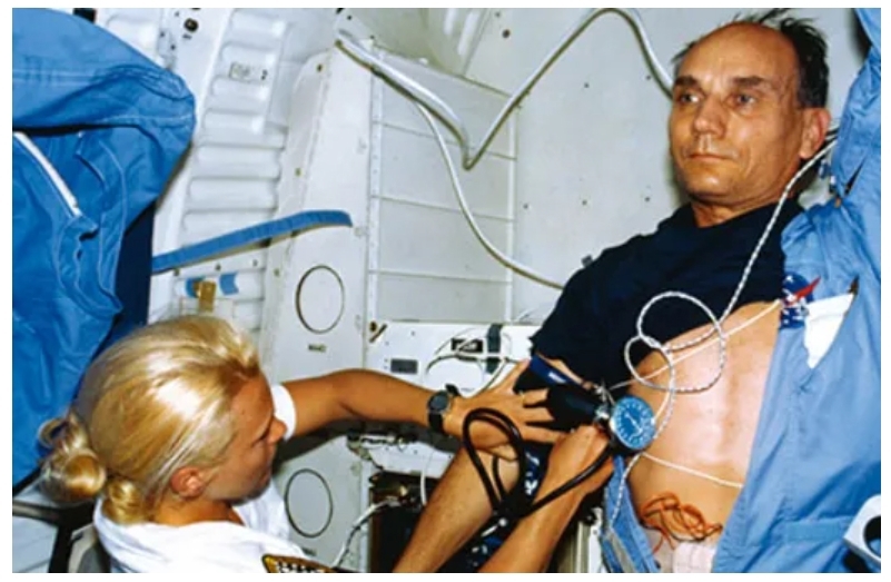 瑞亚·塞登在STS-51-D任务期间与议员杰克·加恩一起进行医学实验