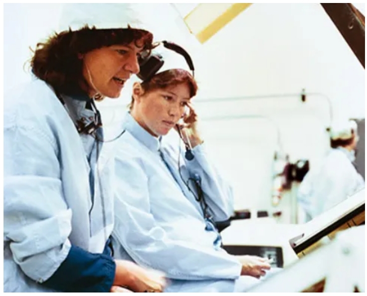 萨莉·赖德和安娜·费舍尔在肯尼迪航天中心为萨莉的STS-7任务的有效载荷进行工作。安娜当时怀着大女儿克里斯汀。