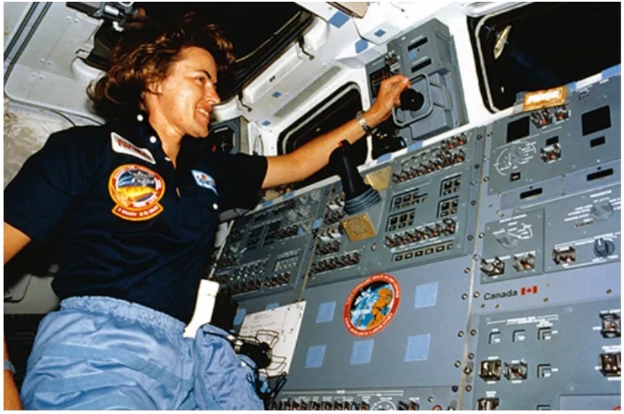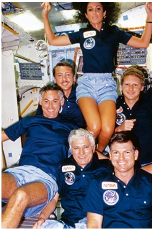 STS-41-D任务的乘组人员在太空中的合影。中间的女性为朱迪思·雷斯尼克,她的长卷发是否会影响太空飞行曾一度成为人们争论的话题。