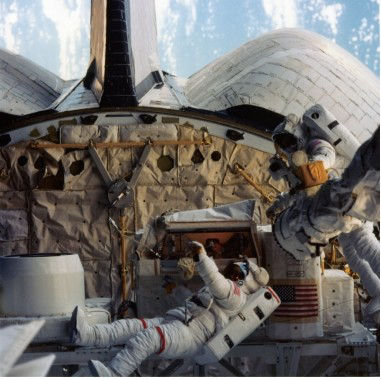 现在他们掌握了抓住卫星的窍门,乘组人员在第六天对“西联星6号”实施了同样的程序,只做了一些调整。这一次,戴尔穿上喷气背包与卫星较量,并将“毒刺”刺入卫星,而乔则被绑在机械臂的末端,抓住卫星的另一侧,把它送入航天飞机的有效载荷舱。这一太空芭蕾产生了他们所期待的效果,两颗卫星都被紧固地安放在有效载荷舱里,戴尔拿出一张纸,上面是鲜红的大字:“出售。”太空行走二人组摆好姿势拍照,他们的成果整齐地摆放在航天飞机的有效载荷舱里。