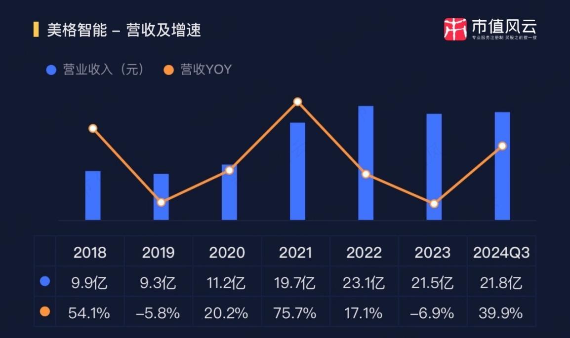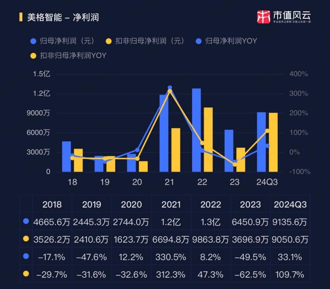 最近几年,美格智能的营收持续增长,利润在2021年爆发,并在2024年再一次突破。根据业绩预告,2024年归母净利润预计1.12亿~1.42亿元(同比+73.62%~120.12%),扣非净利润增速达194%~275%。