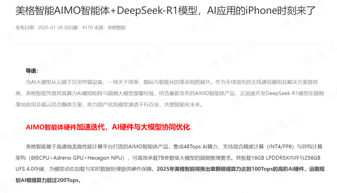 美格智能(002881.SZ),一家专业做模组的上市公司,1月26日在其官网发布一则新闻,其研发团队结合AIMO智能体、高算力AI模组的异构计算能力,结合多款模型量化、部署、功耗优化Know-how,正在加速开发DeepSeek-R1模型在端侧落地应用及端云结合整体方案。