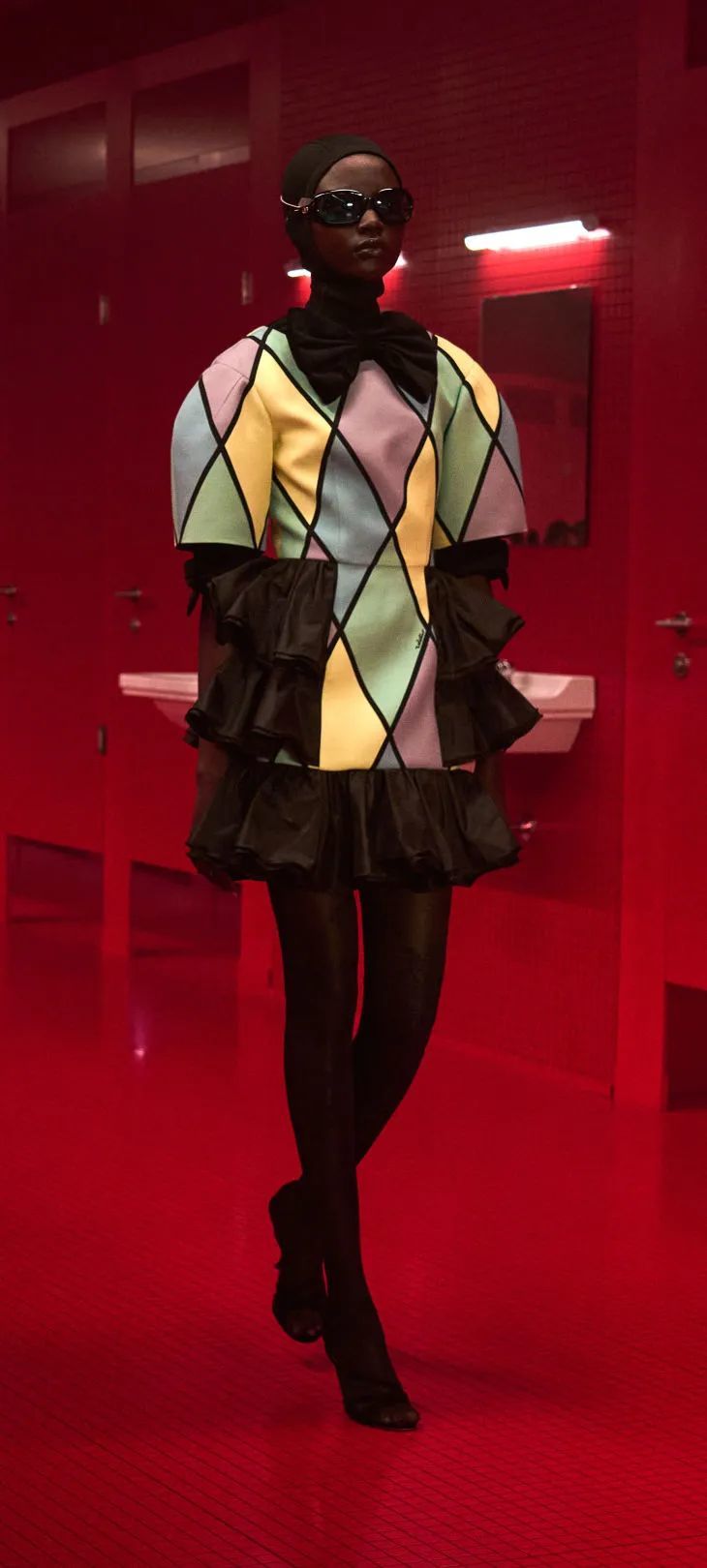 这场秀中「卫生间」就提供了一个「剧场」,模特们在隔断门内的通过穿衣与脱衣的行为,展示了身份建构的元表演。