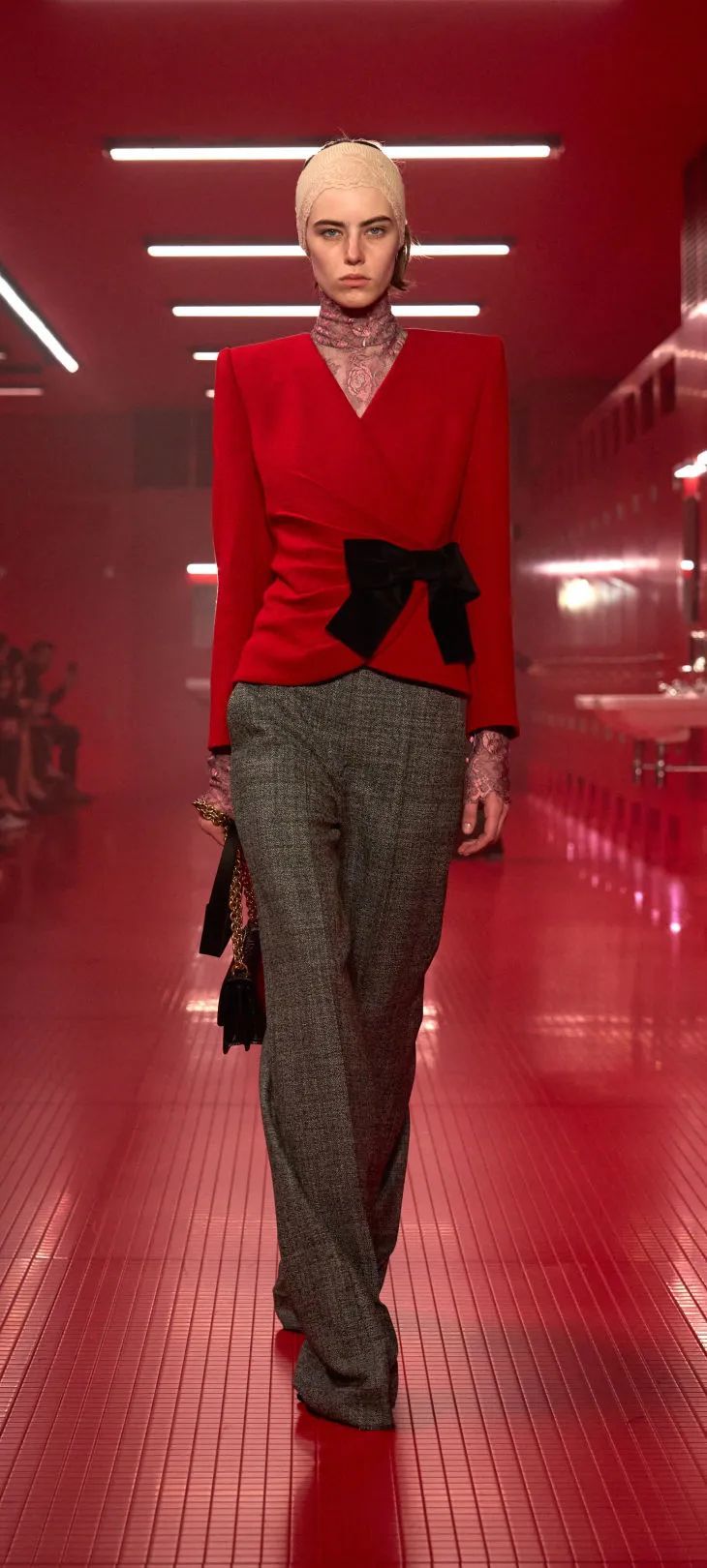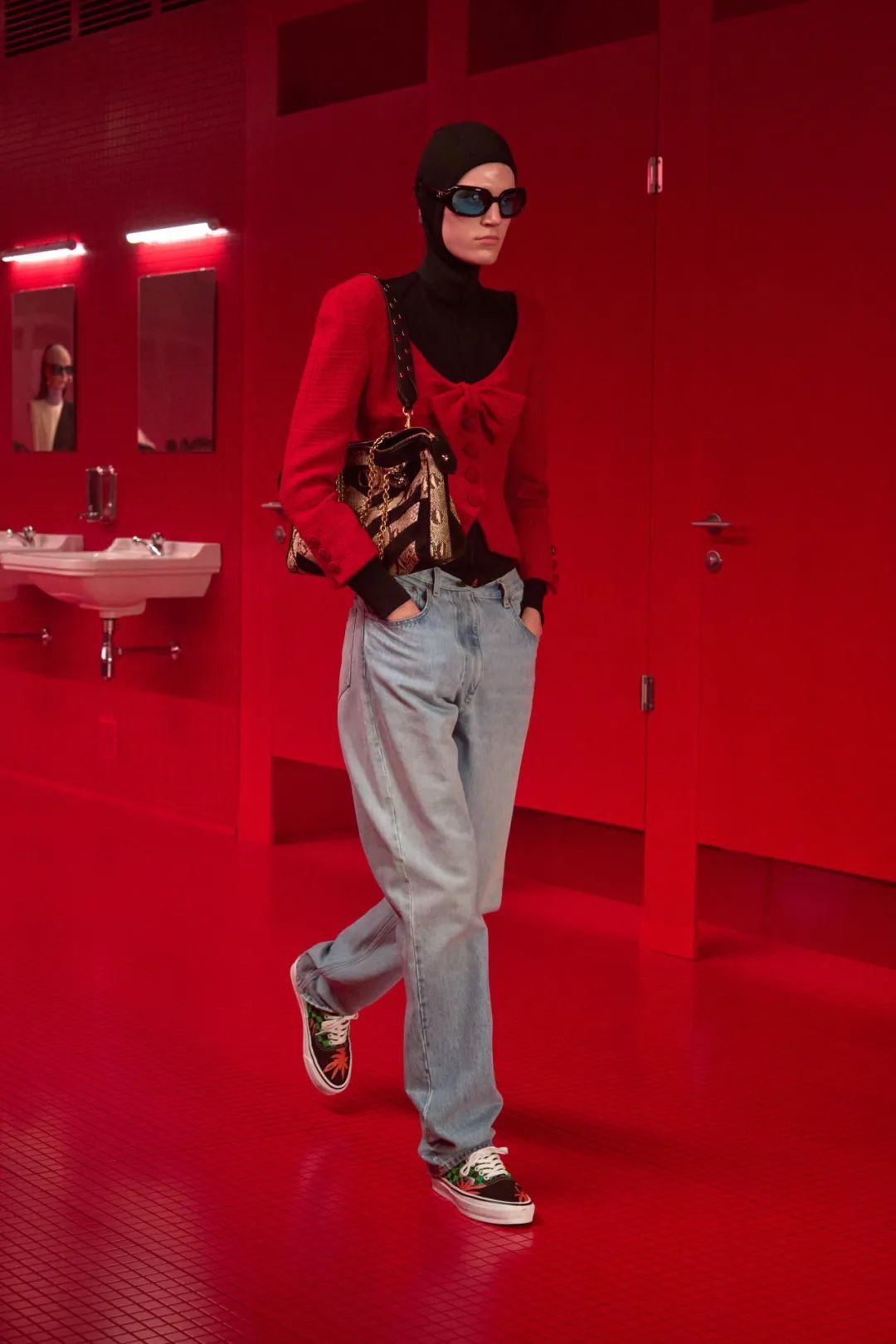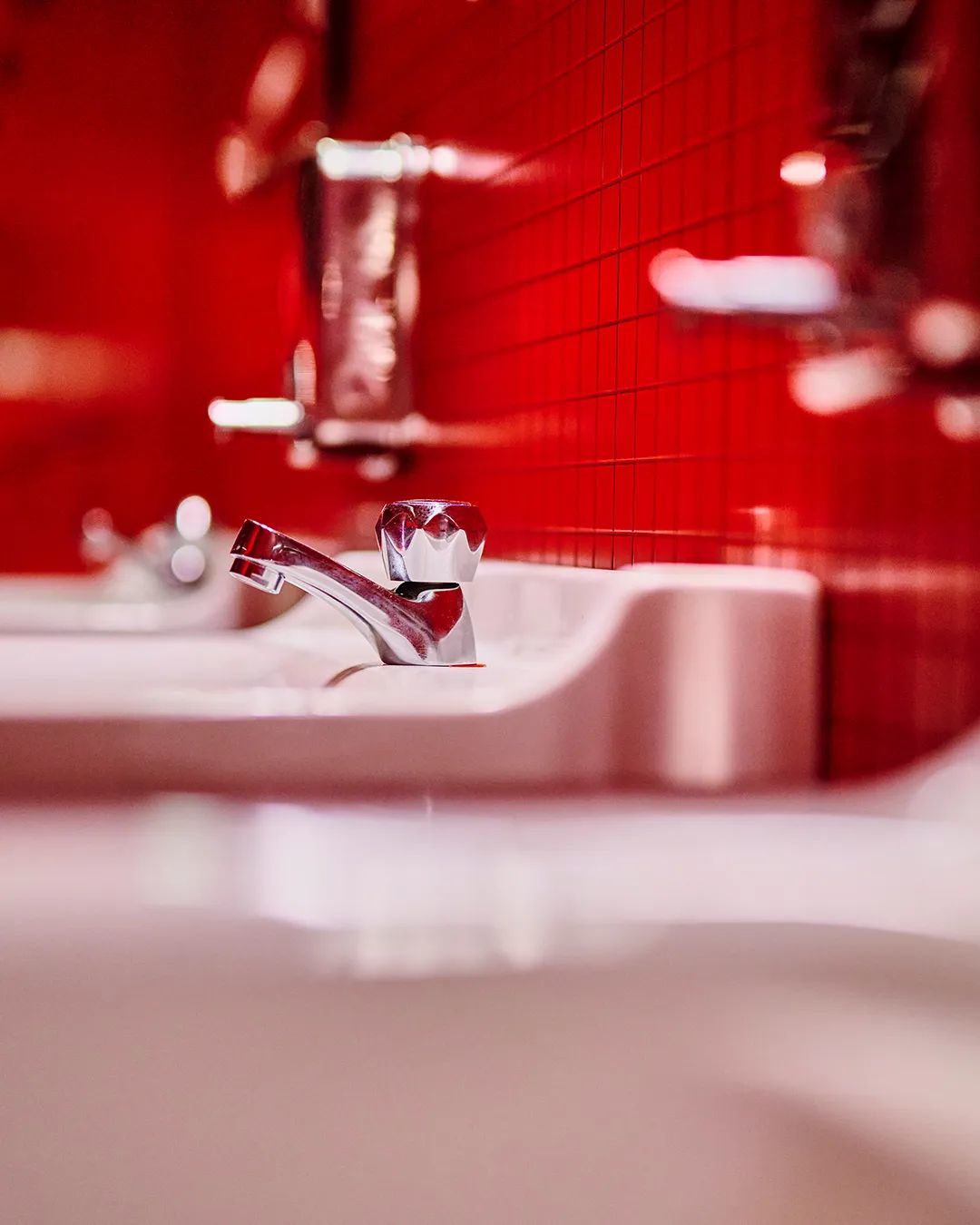 这位意大利电影制片人的儿子,将Valentino 2025秋冬成衣秀场布置成了一间浸透Valentino红的公共卫生间,原样复制了卫生间隔断门、瓷砖、洗手台、皂液器、镜子……