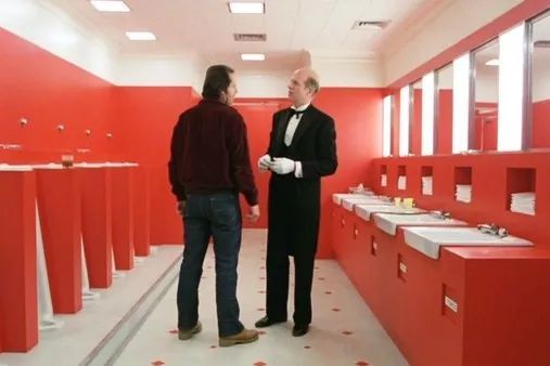 也许可能很多人会和我一样,看到Valentino这个空间还会想起Stanley Kubrick电影《闪灵》。男主角Jack就是在一个红色卫生间里从「失败作家」蜕变为「暴力之王」的。他在恶灵Delbert Grady的诱惑下唤醒了内在被压抑的暴力人格,完成了身份的转化。卫生间似乎天然就具备这样一个「身份转化」的空间喻意。