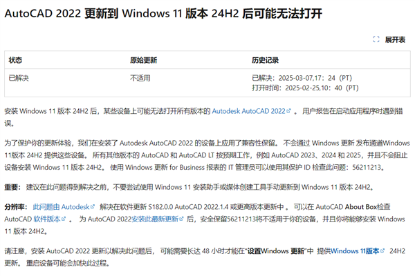 快科技3月11日消息,前不久微软因兼容性问题阻止了安装AutoCAD 2022的设备升级至Windows 11 24H2版本。