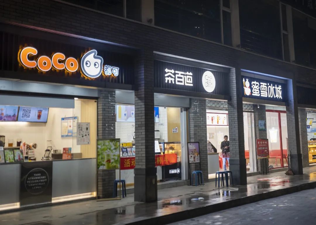 浙江绍兴,同一条街道上的Coco都可、茶百道、蜜雪冰城店铺