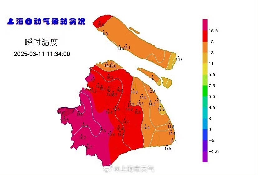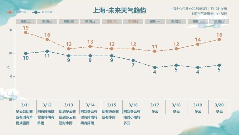 今天白天,上海以多云到阴的天气为主,风不大,东到东南方3-4级。下午气温将明显上升,预计最高气温19℃,相对湿度90%-60%,体感总体比较适宜。不过夜间天气又将发生变化,今天半夜到明天阴有时有阵雨或雷雨,局部地区雨量中等。